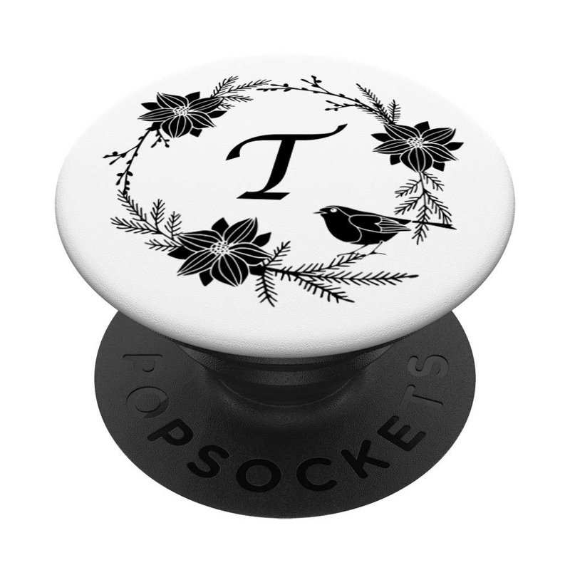 - Matte white & black flower pattern wandering wildflowers floral print with initial T phone circle grip.Black bird design round finger phone holder popup back button gripper for hand,pop phone grip,cellphone car mount,expanding stands for smartphones,tablet