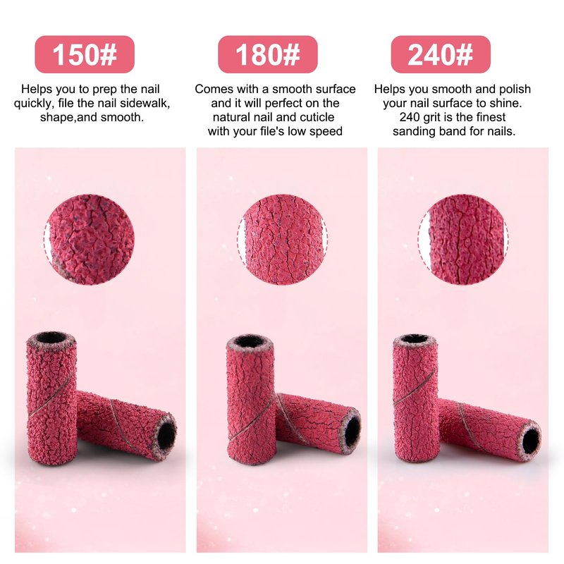- π [Various Grit Options] 150 grit small sanding bands help you to prep the nail quickly, file the nail sidewalk, shape, and smooth. 180 grit mini sanding bands are perfect for the natural nail and cuticle with low rotation speed. 240 grit small sanding bands for nail drill bits help you smooth and polish your nail surface to shine.