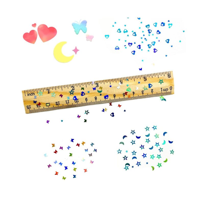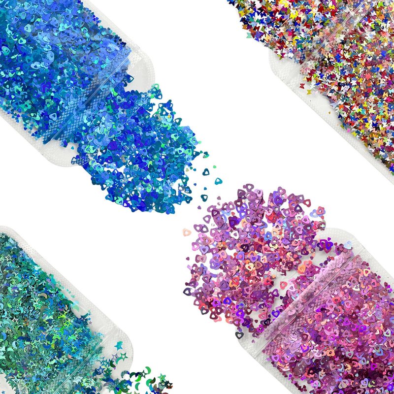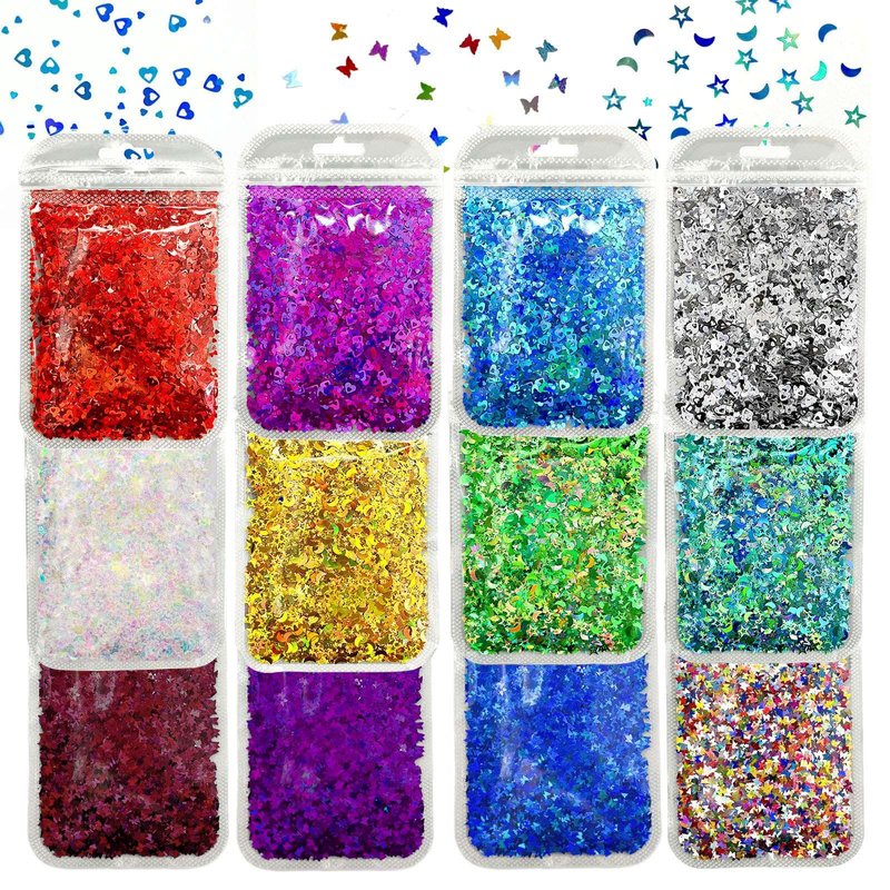 - 【Abundant Supplies】:It is a high-quality craft glitter kit. It contains a total of 4.23oz of glitter, spread over 12 bags, with a weight of 0.35oz per bag. The glitter flakes are shaped like stars, moons, butterflies, and hearts, providing a unique and artistic effect for tumbler, body, face, and nail art, as well as for resin crafts.