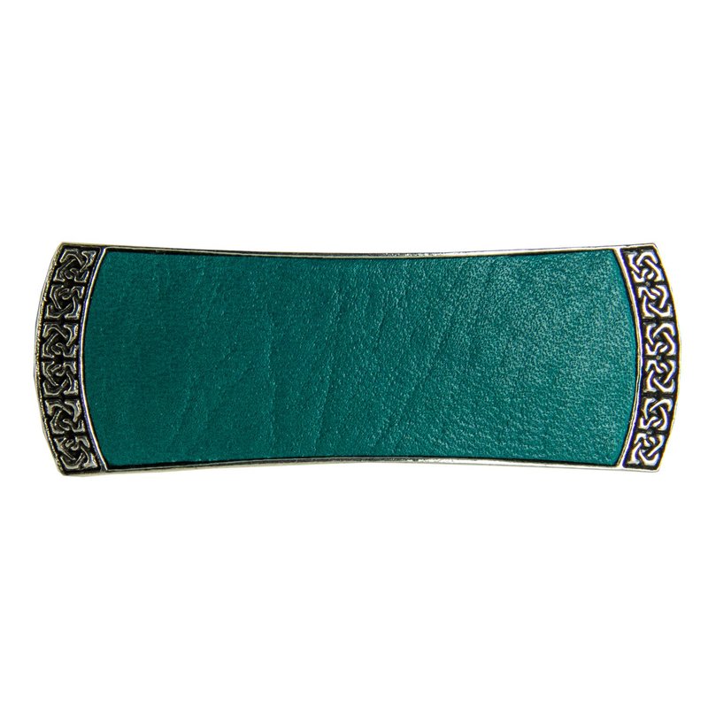 100% Britannia metal and celtic design with leather insert make this barrette one of a kind. Whether you wear it to sweep back one side, in a ponytail or to secure a messy twist, compliments will abound!.