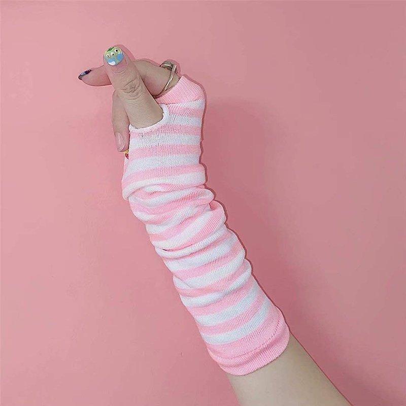 CENAST Women Long Fingerless Gloves Knitted Arm Warmers Thumbhole Stretchy Gloves Pink White