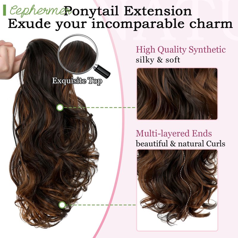 Cephermer Ponytail Extension, 15 Inch Drawstring Ponytail, Dark Brown Mix Light Auburn Wavy Clip in Pony Tails Hair Extensions Natural Looking Synthetic Hairpiece for Women Daily Use party