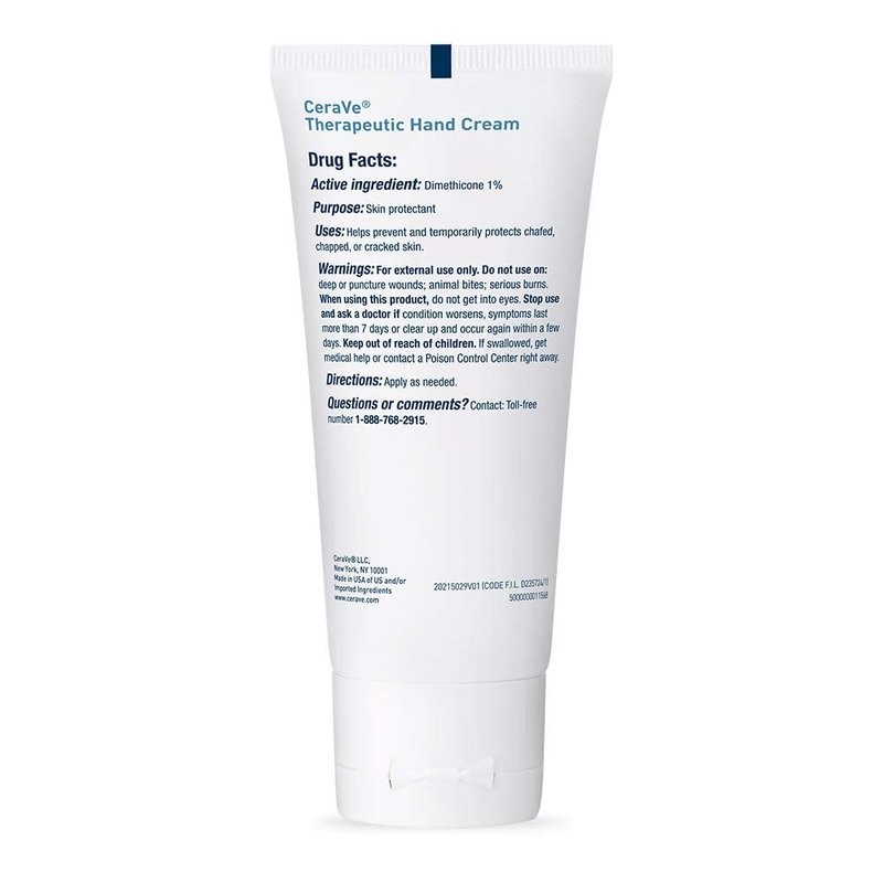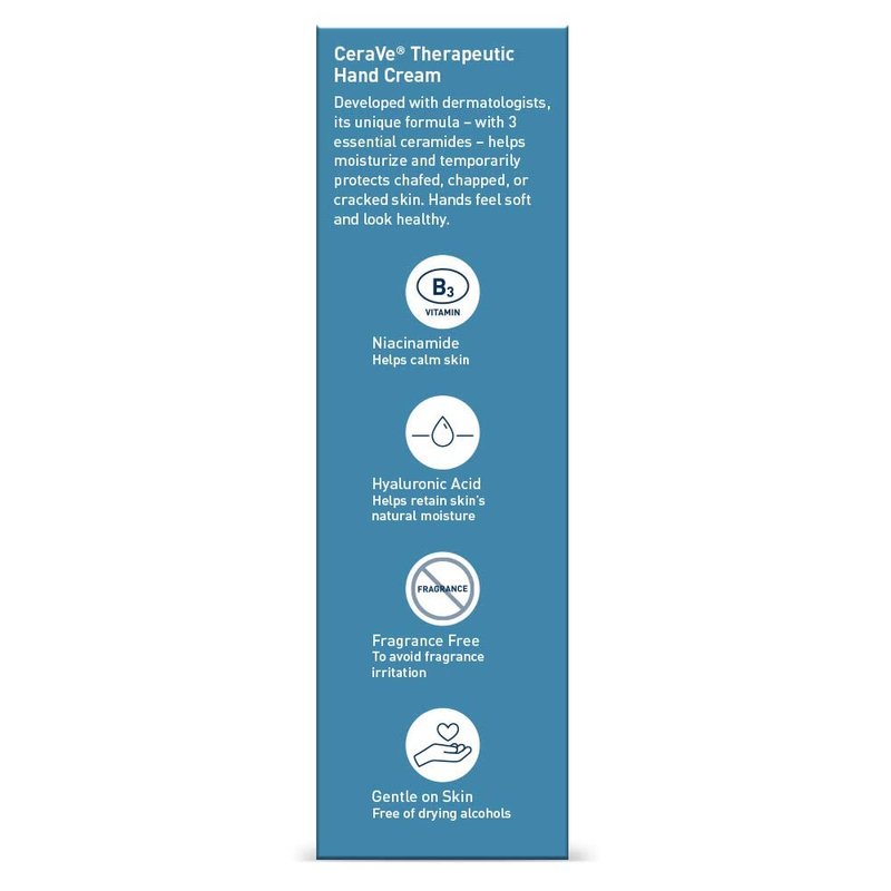 CeraVe Therapeutic Hand Cream For Normal to Dry Skin 3 Ounce (Pack Of 3) - CeraVe Therapeutic Hand Cream: Non-greasy hand cream and skin protectant - Exposure to environmental irritants, frequent handwashing, and common daily activities can take a toll on your hands—especially during the dry winter months. This can lead to skin concerns, including dryness and chafed, chapped, or cracked skin on your hands. Hydrating, fragrance-free hand cream can be a soothing and effective hand care option, even for those with sensitive skin. They can help restore and temporarily protect your skin, alleviate dryness, and support hands that look and feel soft and healthy. CeraVe Therapeutic Hand Cream is developed by dermatologists to help calm and moisturize your skin. It’s formulated with three essential ceramides that work together to lock in skin moisture and help maintain your skin’s protective barrier. Plus, MVE technology continually releases moisturizing ingredients for all-day hydration. This non-greasy, fast-absorbing cream supports smooth, soft hands with a formula that features the skin protectant dimethicone, as well as hyaluronic acid, and niacinamide. How To Use: Apply CeraVe Therapeutic Hand Cream as needed to chafed, chapped, or cracked skin in need of moisture.