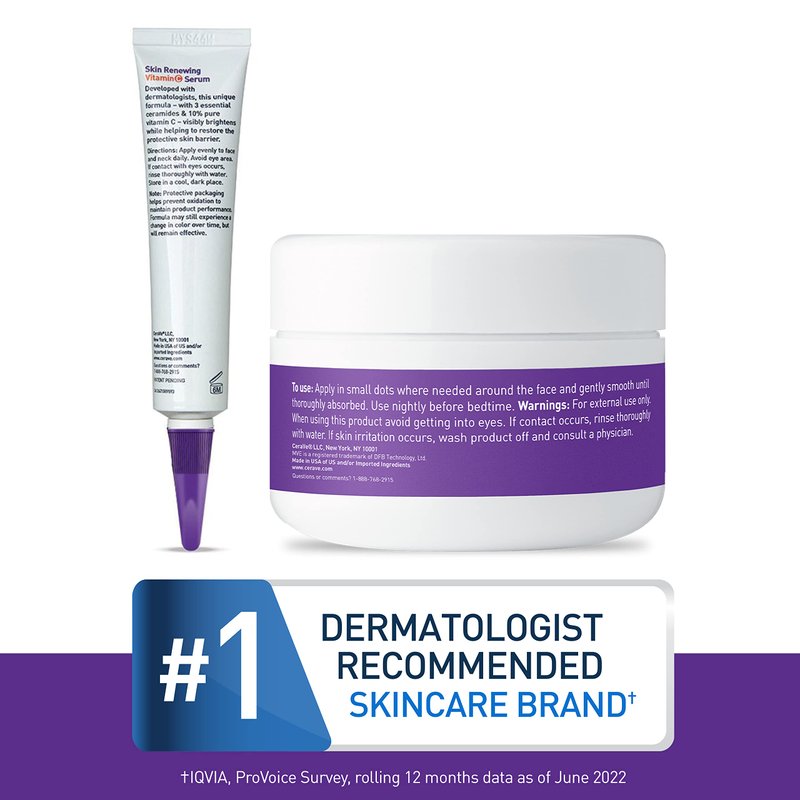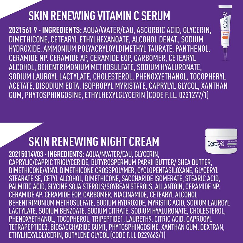 - [ FACE SERUM & HYDRATING NIGHT FACE CREAM FOR HEALTHY AGING SKIN ] Contains an 1oz full size CeraVe Skin Renewing Vitamin C Serum and an 1.7oz full size CeraVe Skin Renewing Night Cream.