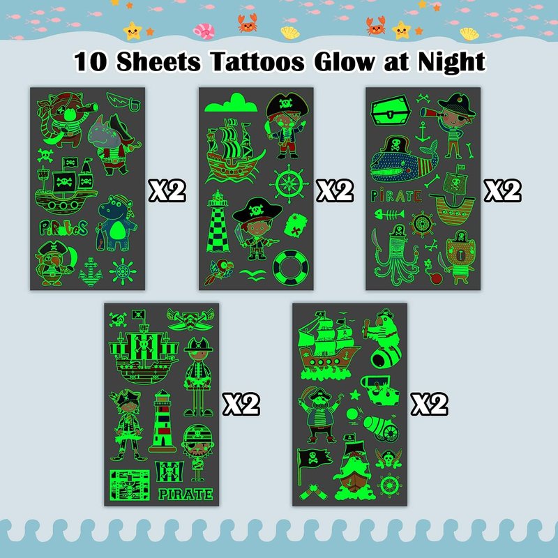 - 【luminous design】Cerlaza luminous pirate temporary tattoos for kids adopt a luminous design, If you take a few seconds to illuminate these tattoos in advance under lamp or sunlights, these pirate tattoos will be more brighter, and the glow effect will last for a whole night and not easy to fade. These tattoos will glow in the night and show a glow of fluorescent color. Kids with these pirate tatoos will be the most dazzling one in the party!