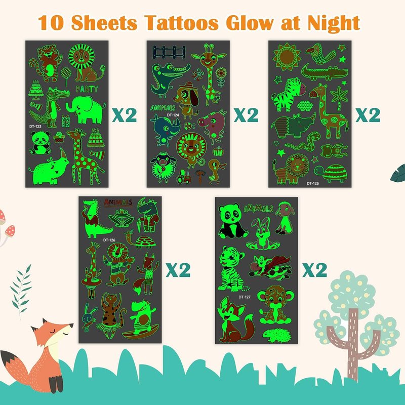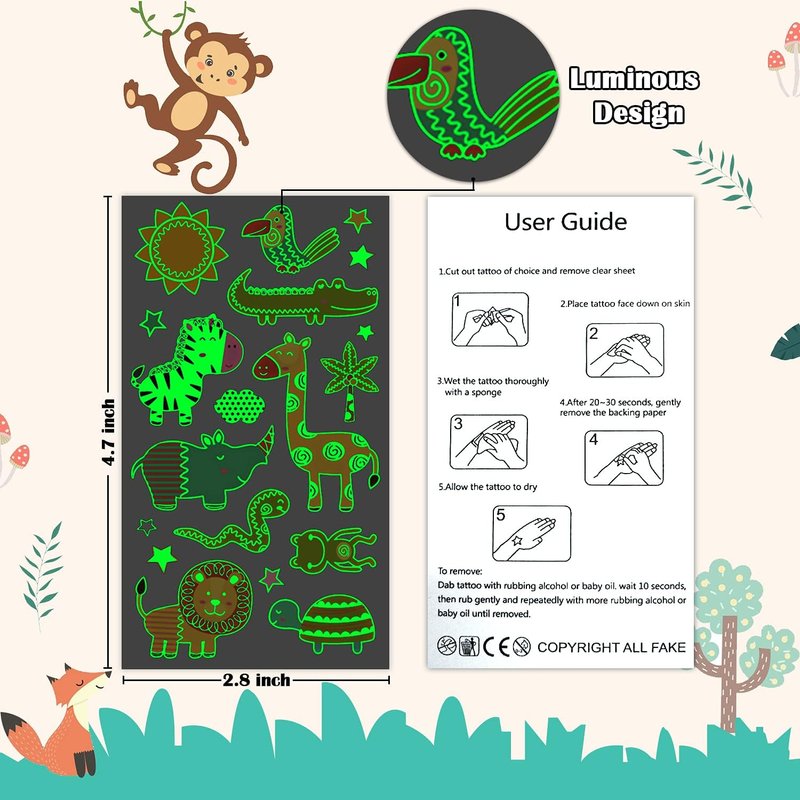 - 【Luminous Design】Cerlaza luminous jungle themed temporary tattoos for kids adopt a luminous design, If you take a few seconds to illuminate these tattoos in advance under lamp or sunlights, these animal tattoos will be more brighter, and the glow effect will last for a whole night and not easy to fade. These tattoos will glow at night and show a glow of fluorescent color.