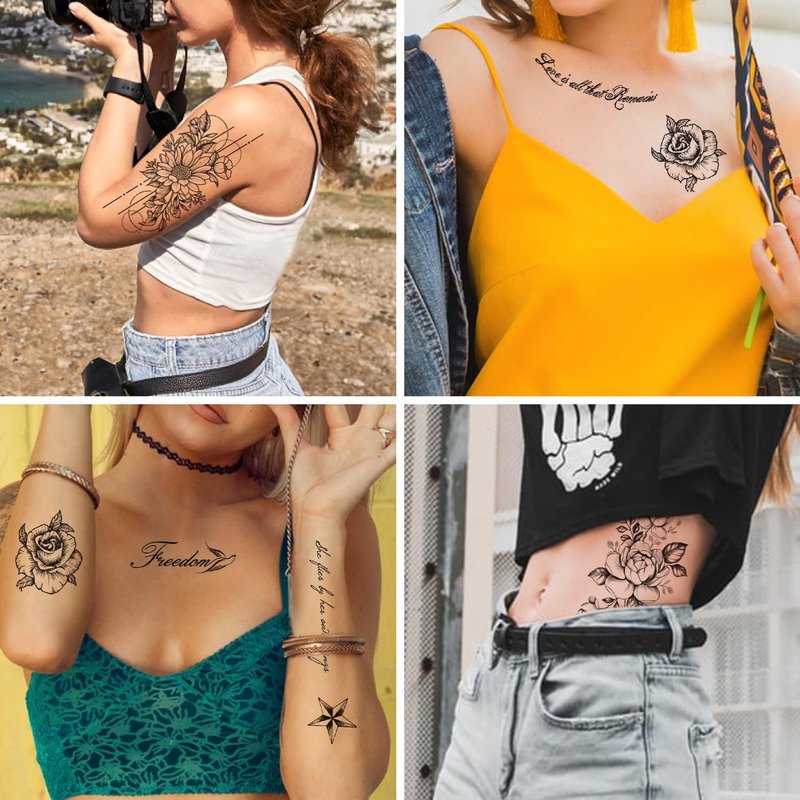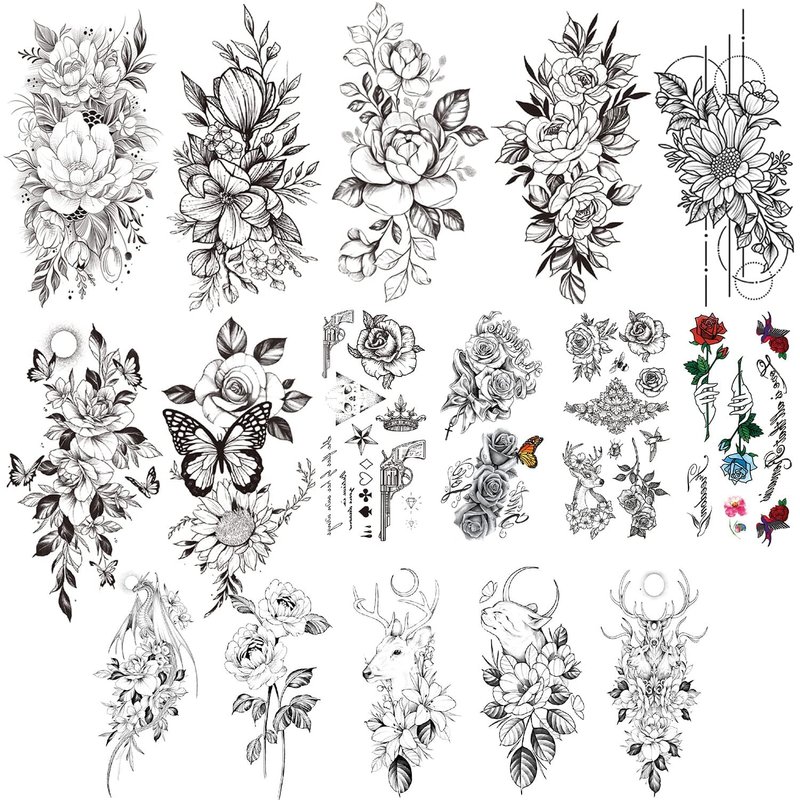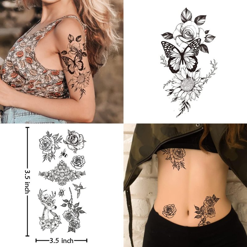 - 【Exquisite Desgins】16 sheets Cerlaza temporary tattoos for women have 35 exquisite styles flowers and butterflies: Cat, Rose, sunflower, colorful butterflies, peony, chrysanthemum,ect.The unique 3D design makes the butterflies stick on the body look real. Other sexy black fake blossom flower tattoo stickers are popular with women adults girls.