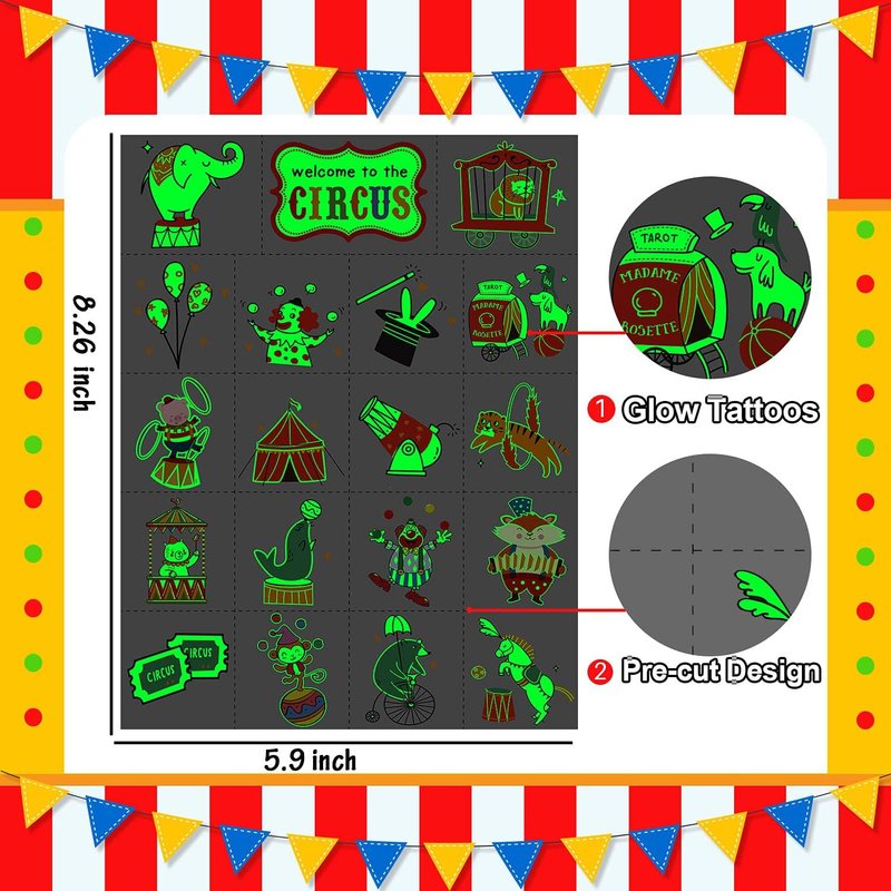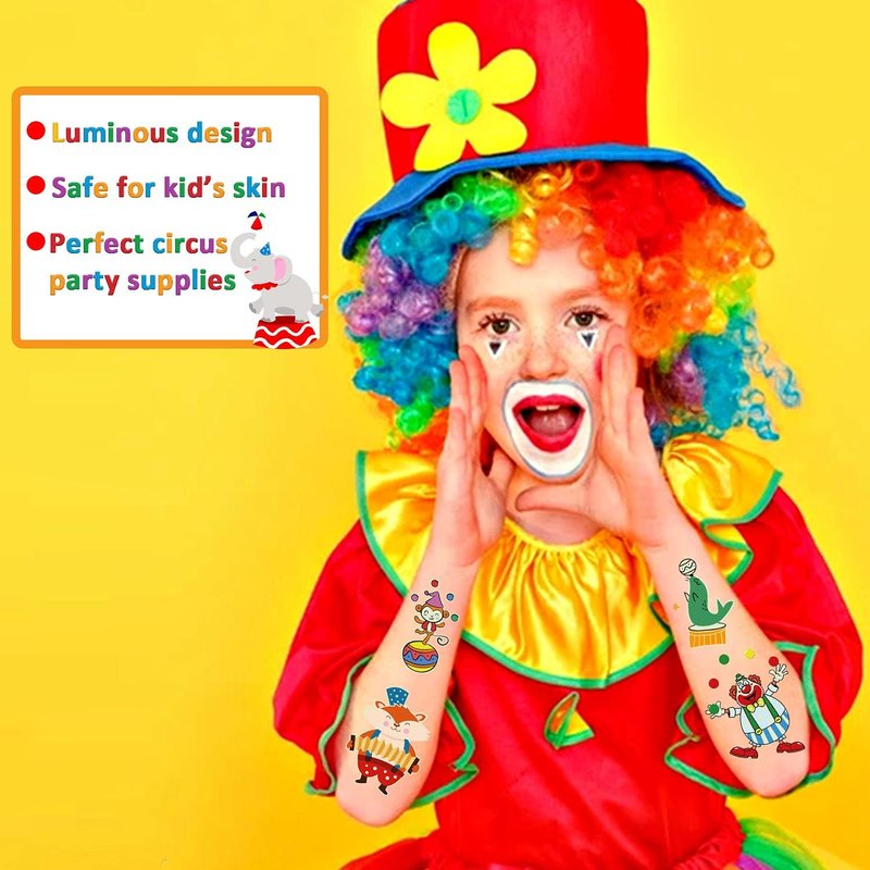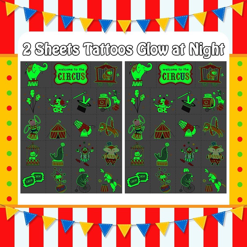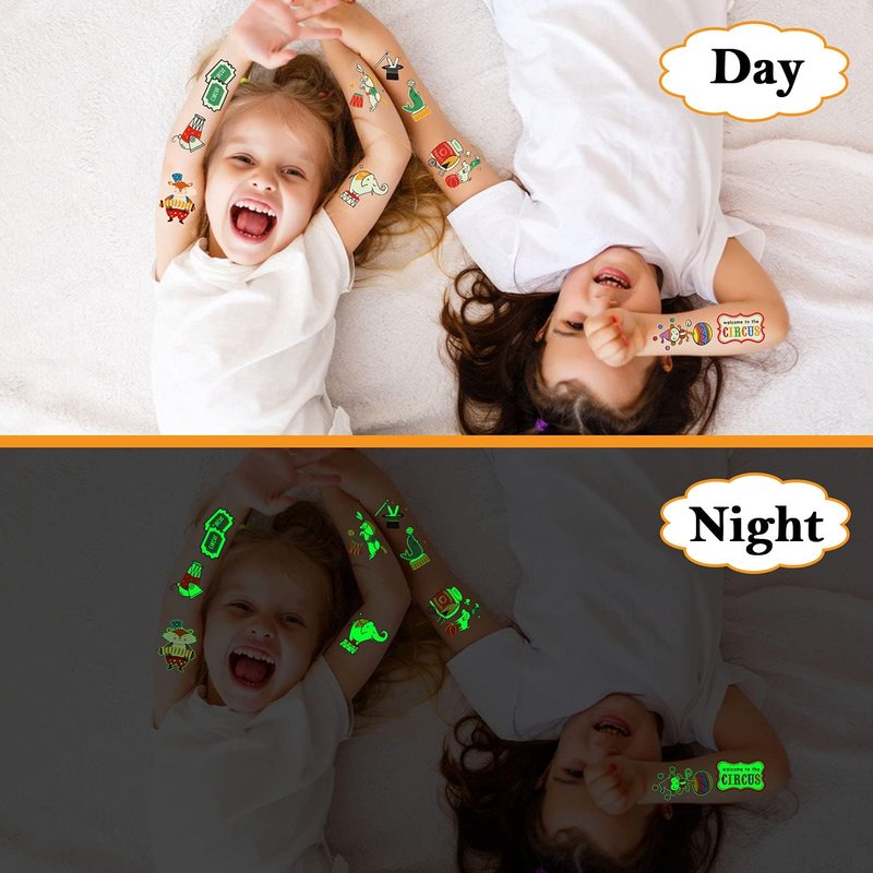 - 【Luminous Design】Cerlaza luminous temporary tattoos for kids adopt a luminous design, If you take a few seconds to illuminate these tattoos in advance under lamp or sunlights, these tattoos will be more brighter, and the glow effect will last for a whole night and not easy to fade. These circus tattoos will glow in the night and show a glow of fluorescent color for a long time.