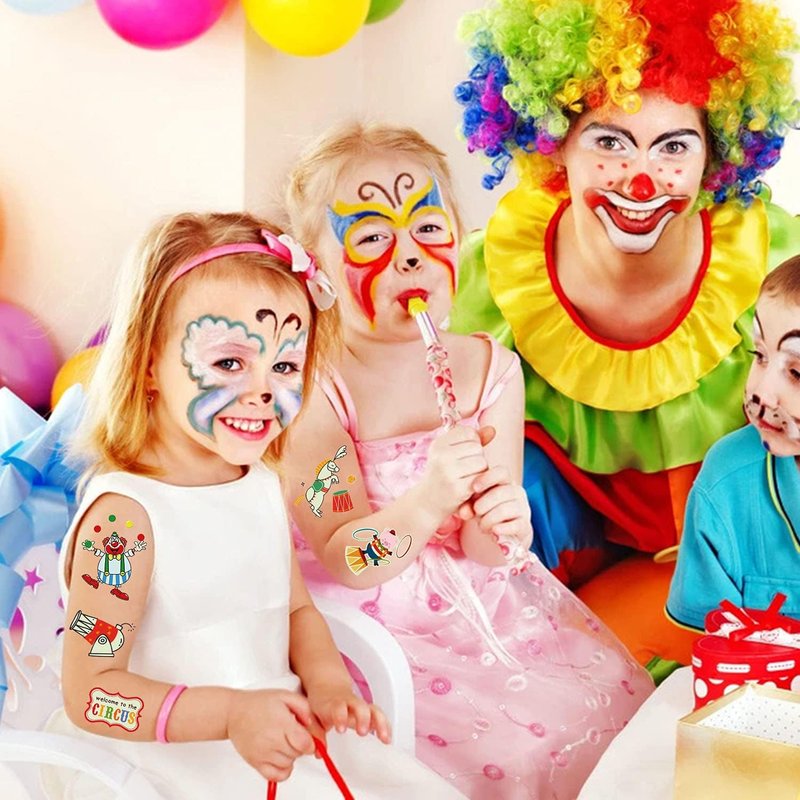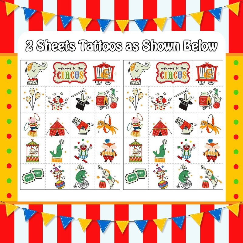 - 【38 Styles Various Tattoos】You will get 38 styles kids circus theme tattoos! 2 Sheets in a pack, each sheet size: 8.3x5.9 inch. Circus theme tattoos including circus, clown, elephant, magic, balloon, tiger, seal, bear, horse, tickets, animal show,etc.