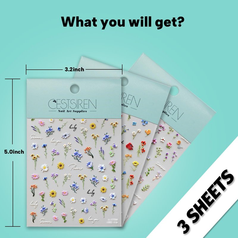 - Nail Stickers Set: You will get 3 sheets of flower nail stickers in 3 different style.All of the stickers are 3D Embossed. Experience the ultimate convenience and creativity with our nail art sticker set