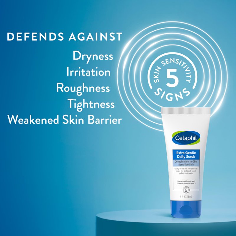- CETAPHIL EXTRA GENTLE DAILY SCRUB: Three-in-one facial scrub cleanses, nourishes and soothes sensitive skin
