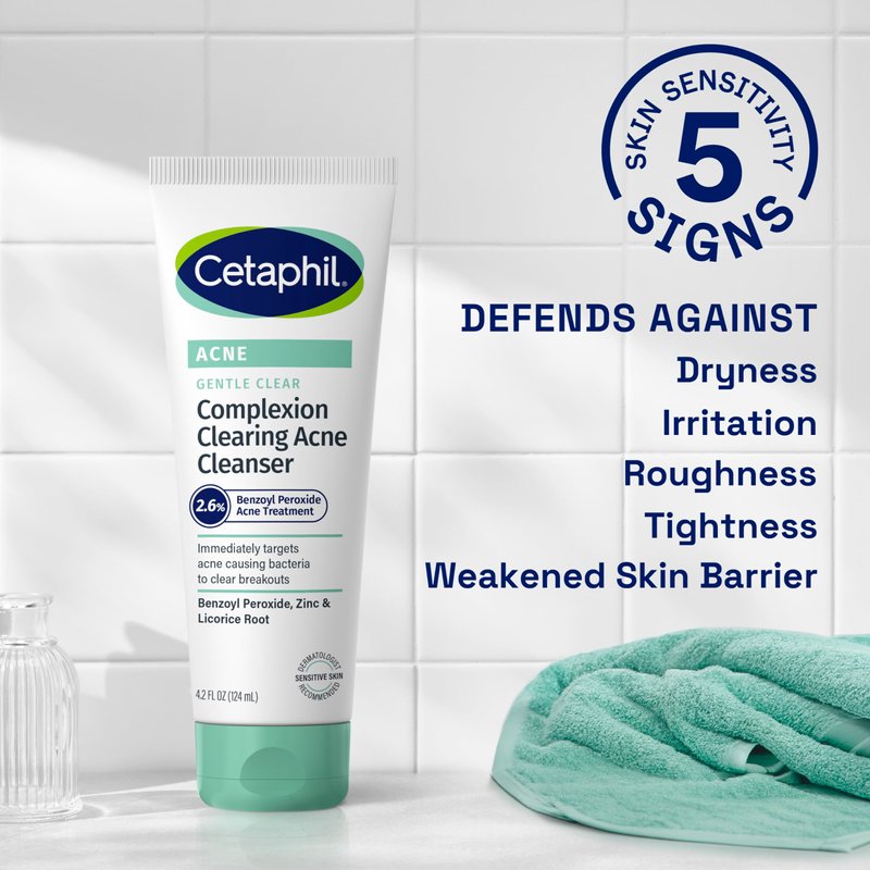 Cetaphil Gentle Clear Complexion-Clearing BPO Acne Cleanser with 2.6% Benzoyl Peroxide, Creamy and Soothing for Sensitive Skin, Suitable for All Skin Types, 4.2oz