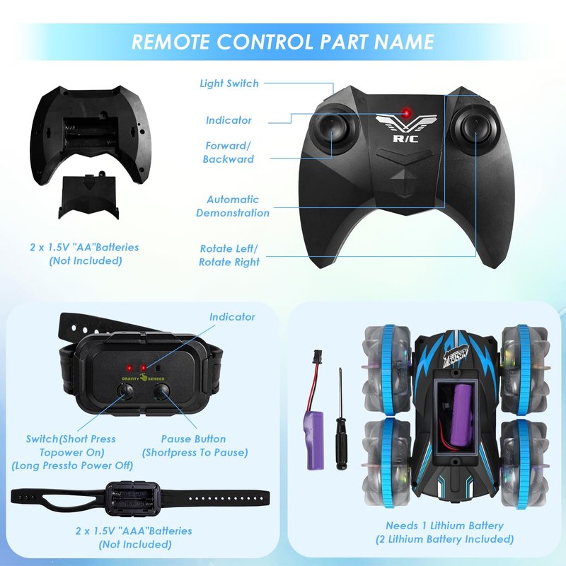 - 【Two Remote Controller & Colorful LED Lights】The rc car comes with two remote control control, By moving your arm or twisting your wrist, the rc car can perform 360° stunts effortlessly and your kids can enjoy more driving pleasure with gestures. The amphibious rc car is designed with colorful LED lights, bring amazing operation experience and visual effects, cool functions and unlimited fun to kids.