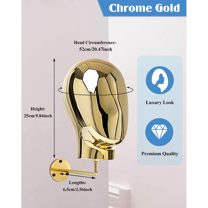 CHADWICK Hat Display Stand Wall Mount Chrome Wig Head Stand Stylish Mannequin Head Stand Durable Wig Holder for Hats, Wigs, Glasses, Luxury Look at Home, Salon, Head Swivels, 20 Inch Circumference