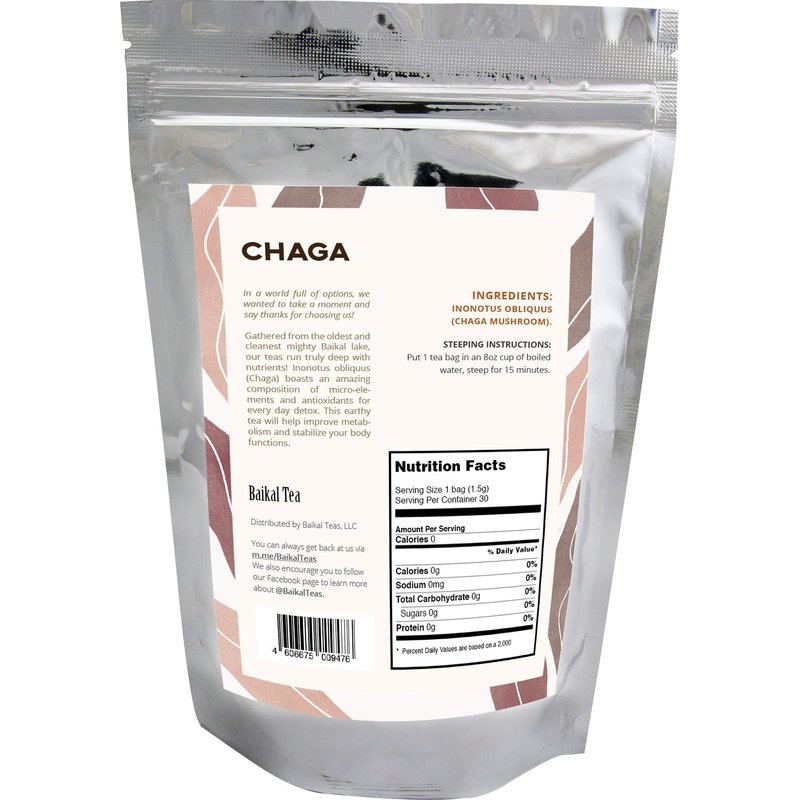 Chaga Tea - 100% Wild Siberian Birch Chaga Mushroom - Organic - 30 Unbleached Tea Bags - Pure No Additives - Natural Detox and Digestive Support - Hand-Picked by Baikal Tea