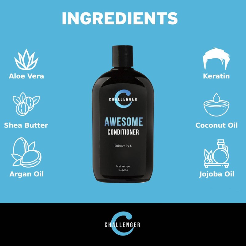 - Challenger Awesome Conditioner has great restoration and hydrating ingredients, including Aloe Vera, Olive Oil, Shea Butter, Argan Oil, Coconut Oil, Jojoba Oil, and Hydrolyzed Keratin. That’s some A+ Awesome Conditioner right there!
