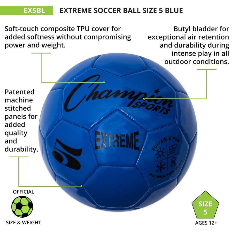 Champion Sports Extreme Series Soccer Ball, Regulation Size 5 - Collegiate, Professional, and League Standard Kick Balls - All Weather, Soft Touch, Maximum Air Retention - for Adults, Teenagers, Blue