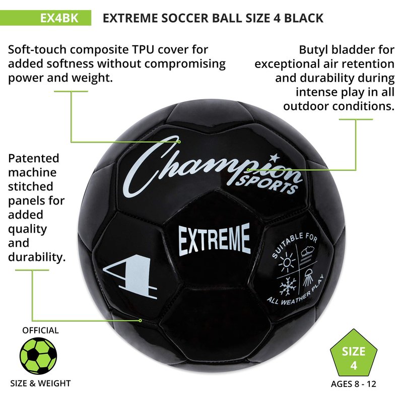 Champion Sports Extreme Series Soccer Ball, Size 4 - Youth League, All Weather, Soft Touch, Maximum Air Retention - Kick Balls for Kids 8-12 - Competitive and Recreational Futbol Games, Black