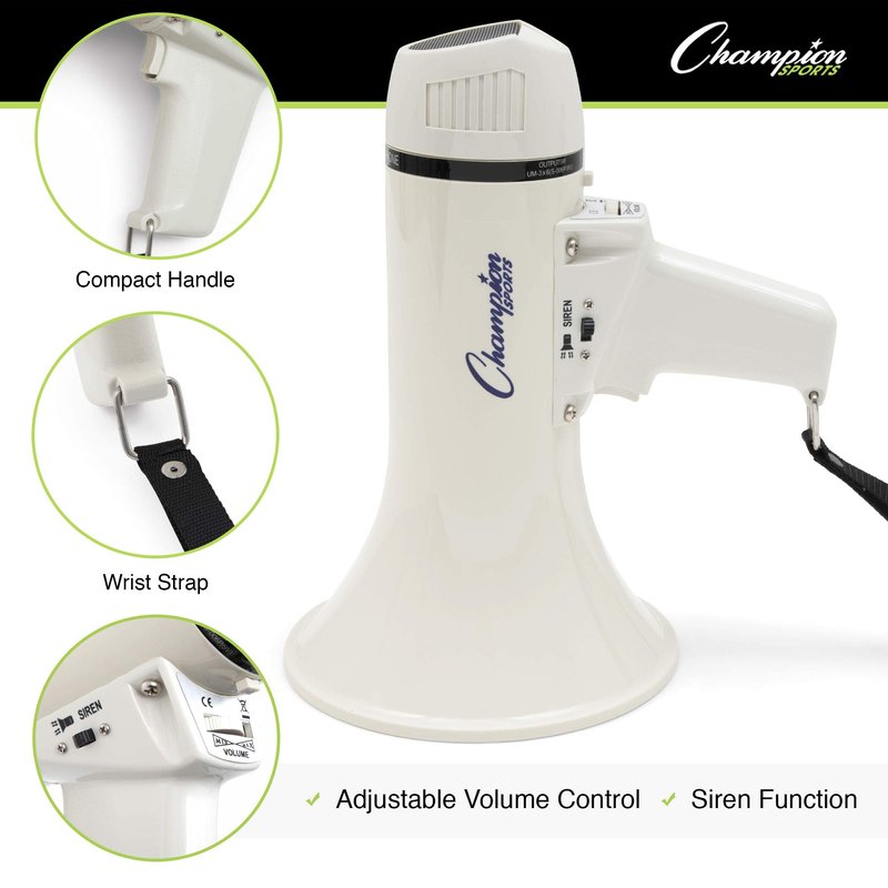 Champion Sports Megaphone with Siren, Wrist Strap, Compact Handle, 800 Yard Range - Powerful Bullhorn Loudspeaker with Adjustable Volume Control for Sport Events, Concerts, Crowd Control, 4 Watts (White), Model: MP4W