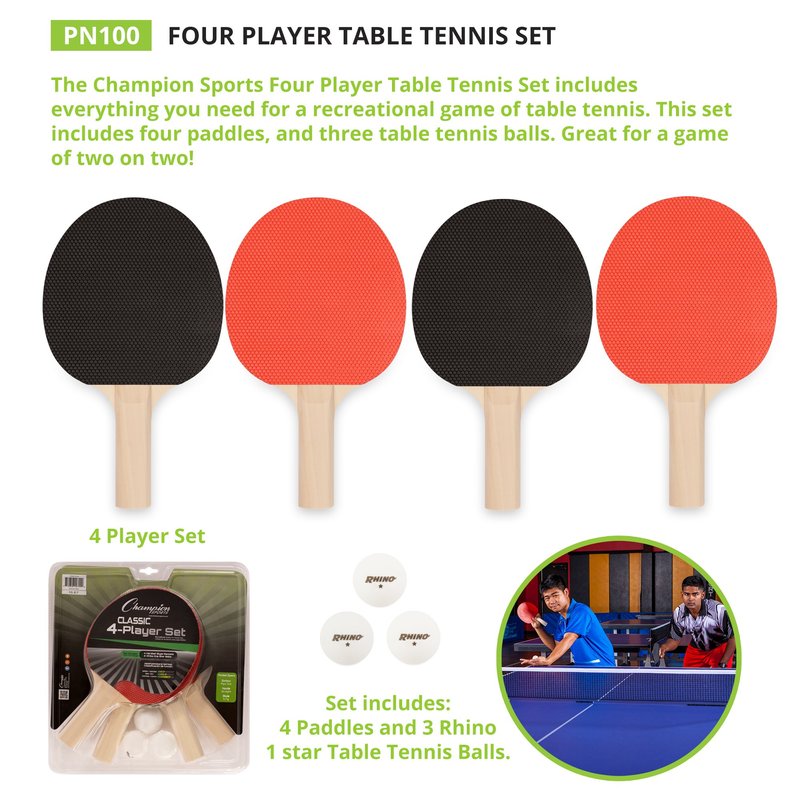 - 4 PLAYER SET: The Champion Sports four player paddle set includes 4 rackets and 3 balls for beginning, intermediate, and advanced players to play one on one games on any ping pong table