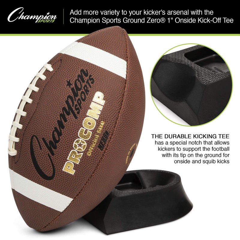 - ELEVATE YOUR KICKING GAME: Practice kicking on your own without a coach, friends, or teammates. The Champion Sports onside kickoff tee holds a football steady and at an optimal angle for practicing onside or squib kicks.