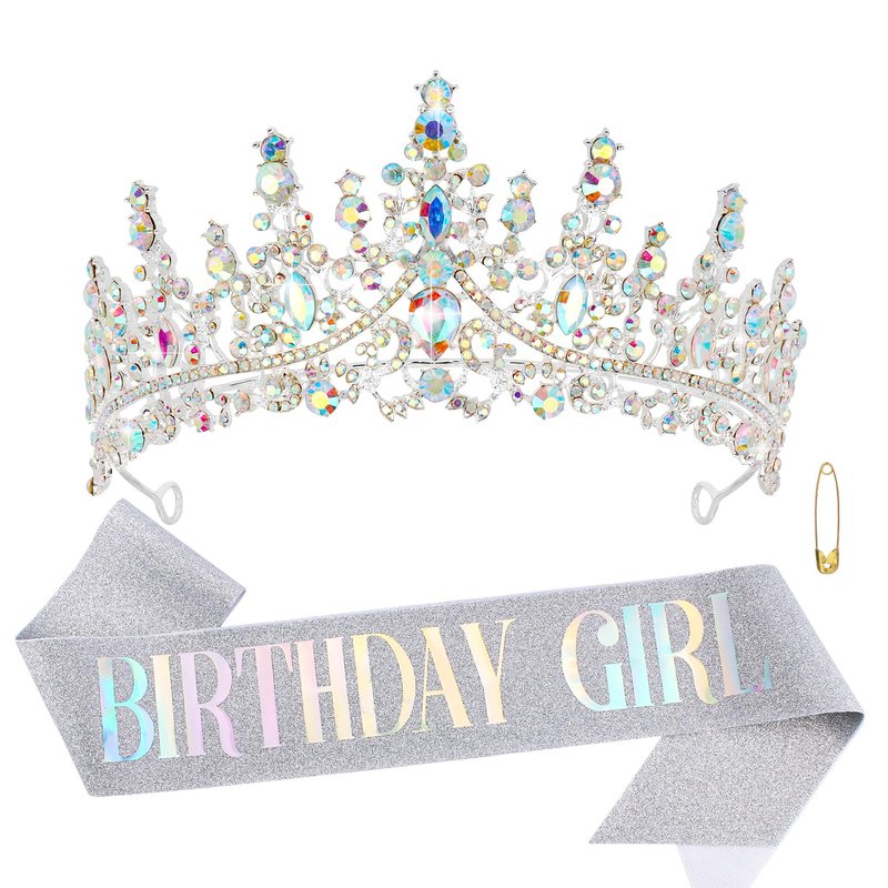 CHANACO Birthday Crown Tiaras for Women Birthday Girl Sash Crystal Birthday Tiara AB Rhinestone Birthday Headband Princess Crown for Girls Hair Accessories Happy Birthday Party Decorations