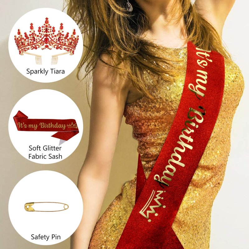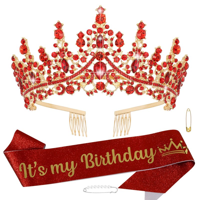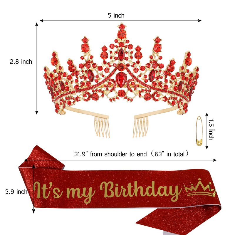CHANACO Birthday Crown Tiaras for Women Its My Birthday Sash Red Crystal Birthday Tiara Rhinestone Birthday Headband Princess Crown for Girls Hair Accessories Happy Birthday Party Decorations