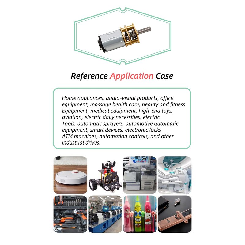 Mainly used in RC car,DIY toys,instrumentation, office automation, home appliances. Such as electronic door locks, camcorders,cameras, projectors, monitors, robotics, vending machines,game machines, cash registers, massage etc.