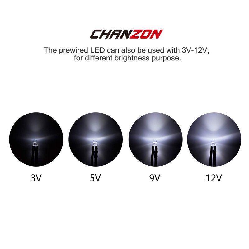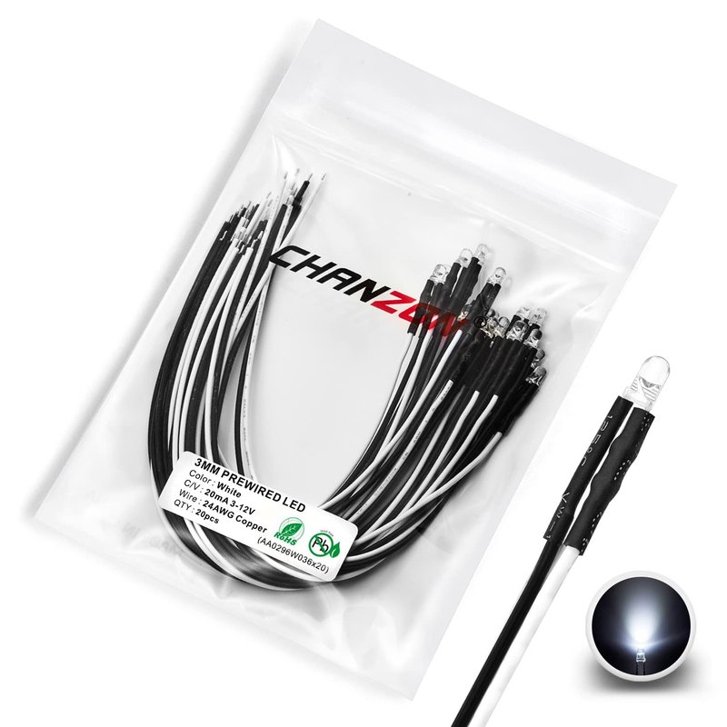 CHANZON 20 pcs Pre-Wired 3mm White LED Diode Lights (Clear Round Transparent Lens DC 12V) with 560 ohms 1/4W Resistor and 24awg Wire Indicator Light Emitting Diodes Lighting Bulb Lamp