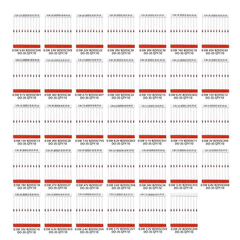 - 0.5 Watt Zener Diodes Assortment Set (Pack of 34 Values, Each 10 Pieces, Total 340 Pieces)