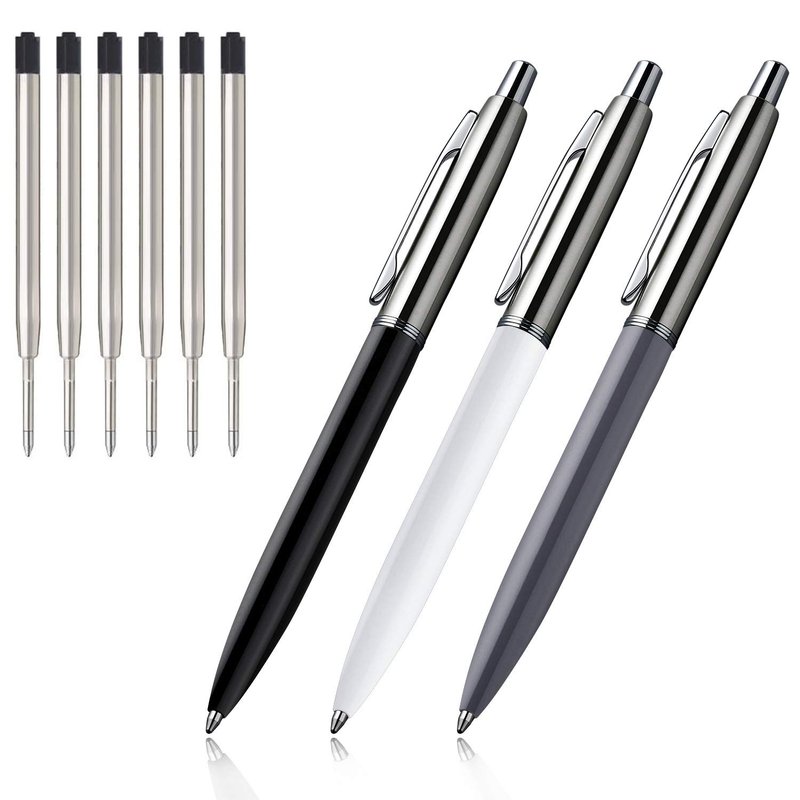 ChaoQ Ballpoint Pen, 3 Pcs Retractable Metal Ballpoint Pens, for Gift, Business, Office, 1.0mm Medium Point Black Ink, 6 Extras Replaceable Metal Refills, (3 Pens and 6 Refills) - Black, White, Gray