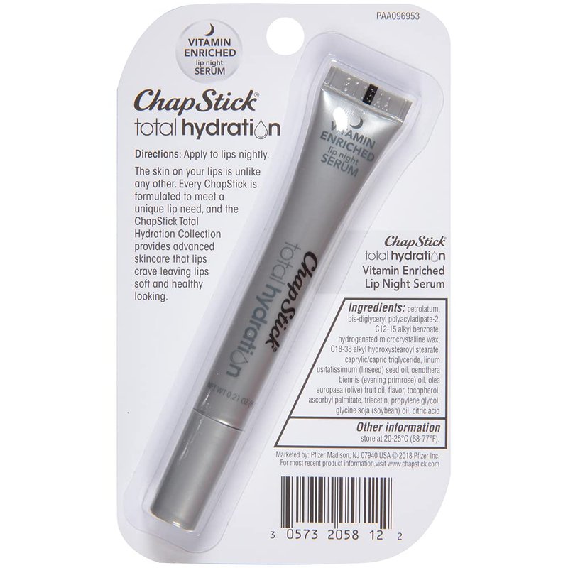 - One 0.21-ounce ChapStick Total Hydration Vitamin Enriched Lip Night Serum for Lip Care