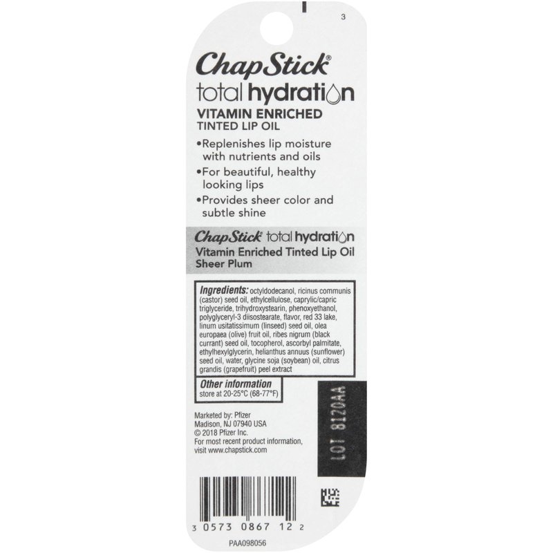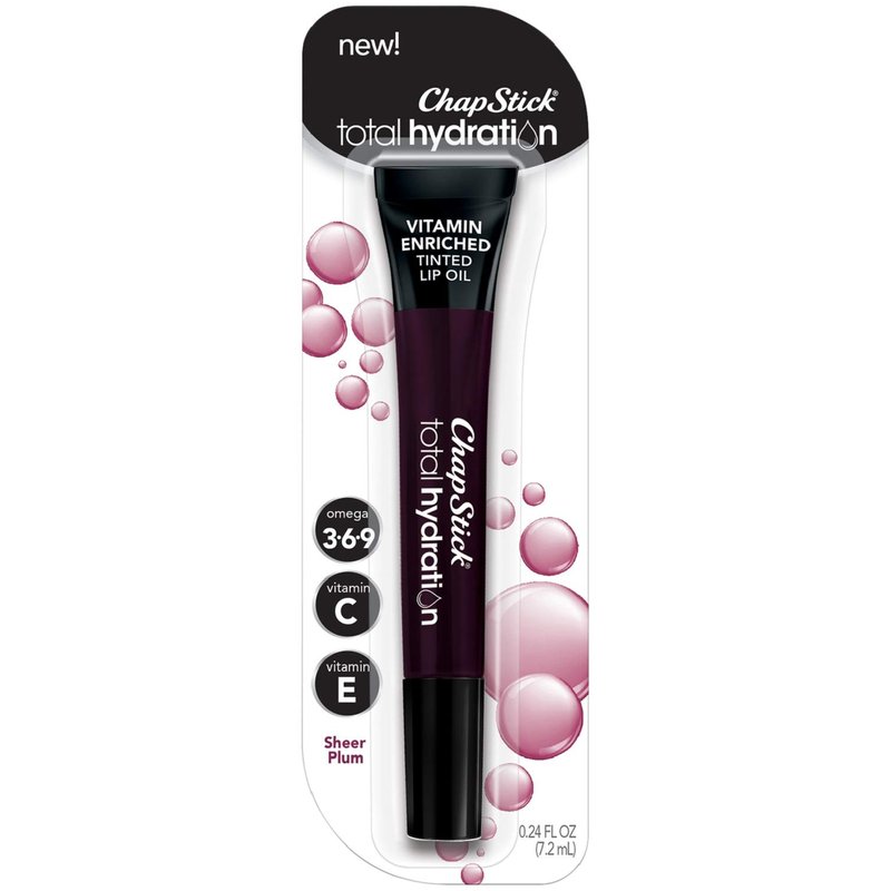 - One 0.24-ounce ChapStick Total Hydration Vitamin Enriched Sheer Plum Tinted Lip Oil Tube, Lip Care