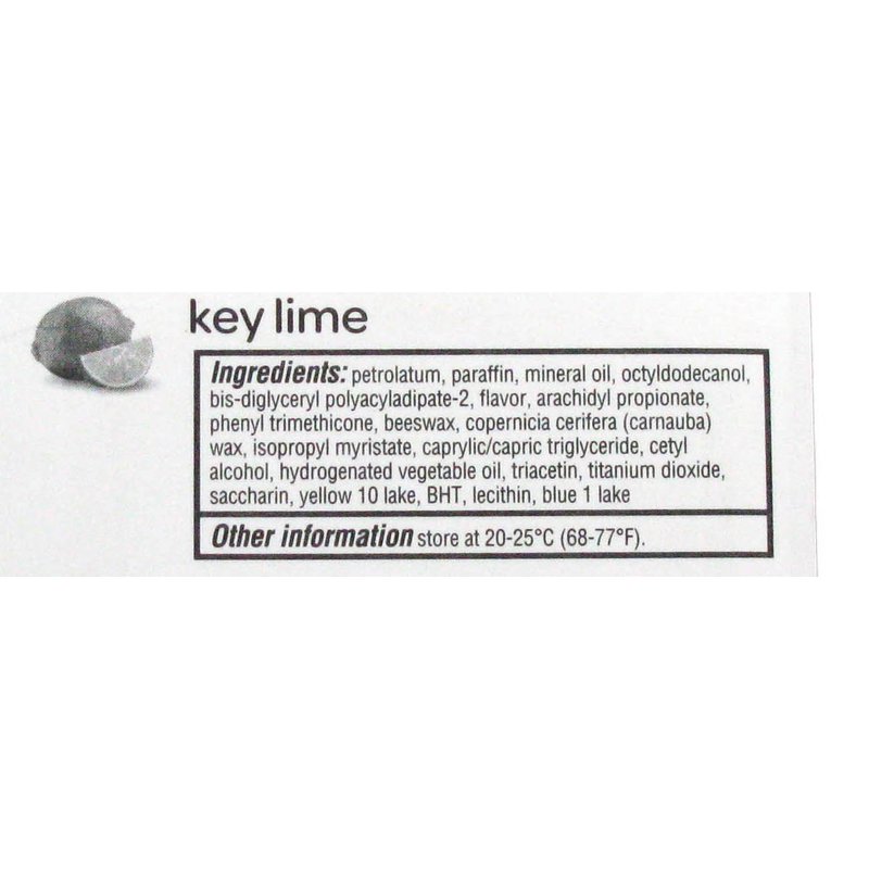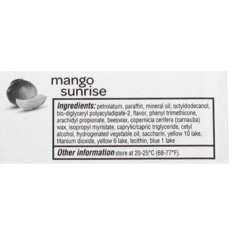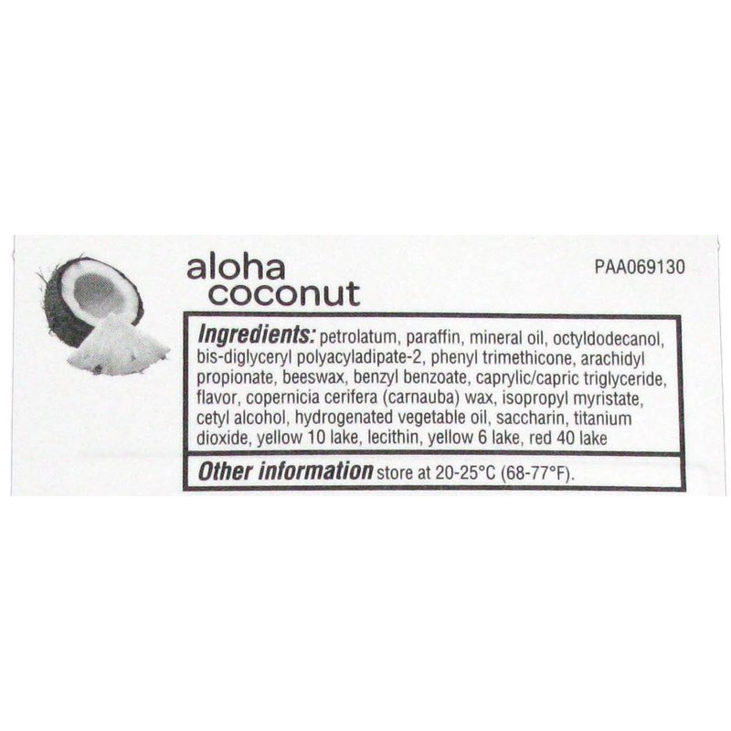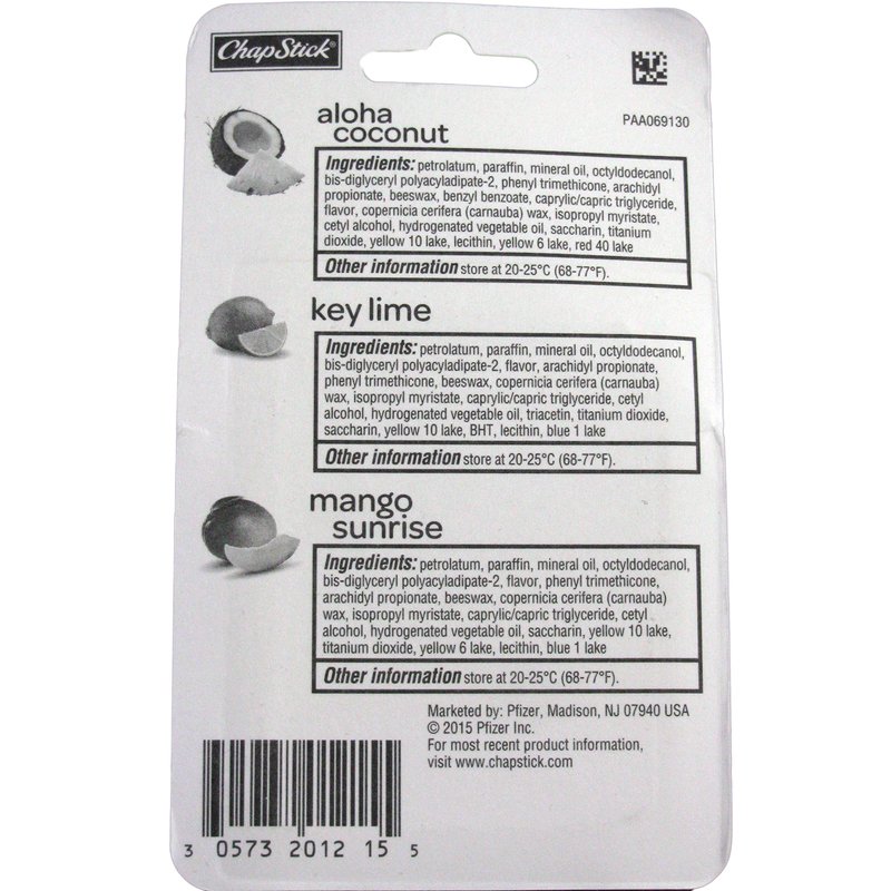 Updated package containing three sticks of lip care product: 1 - Aloha Coconut flavor; 1- (NEW) Key Lime flavor; and 1 - Mango Sunrise flavor. Aloha Coconut Ingredients: petrolatum, paraffin, mineral oil, octyldodecanol, bis-diglyceryl polyacyladipate-2, phenyl trimethicone, arachidyl propionate, beeswax, benzyl benzoate, caprylic/capric triglyceride, flavor, copernicia cerifera (carnuba) wax, isopropyl myristate, cetyl alcohol, hydrogenated vegetable oil, saccharin, titanium dioxide, yellow 10 lake, lecithin, yellow 6 lake, red 40 lake Key Lime Ingredients: petrolatum, paraffin, mineral oil, octyldodecanol, bis-diglyceryl polyacyladipate-2, flavor, arachidyl propionate, phenyl trimethicone, beeswax, copernicia cerifera (carnuba) wax, isopropyl myristate, caprylic/capric triglyceride, cetyl alcohol, hydrogenated vegetable oil, triacetin, titanium dioxide, saccharin, yellow 10 lake, BHT, lecithin, blue 1 lake Mango Sunrise Ingredients: petrolatum, paraffin, mineral oil, octyldodecanol, bis-diglyceryl polyacyladipate-2, flavor, phenyl trimethicone, arachidyl propionate, beeswax, copernicia cerifera (carnuba) wax, isopropyl myristate, caprylic/capric triglyceride, cetyl alcohol, hydrogenated vegetable oil, saccharin, yellow 10 lake, titanium dioxide, yellow 6 lake, lecithin, blue 1 lake
