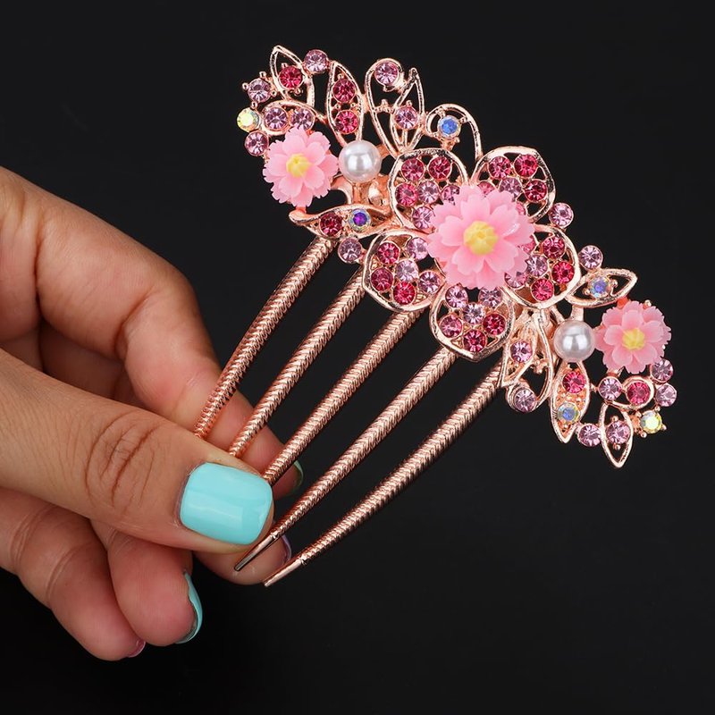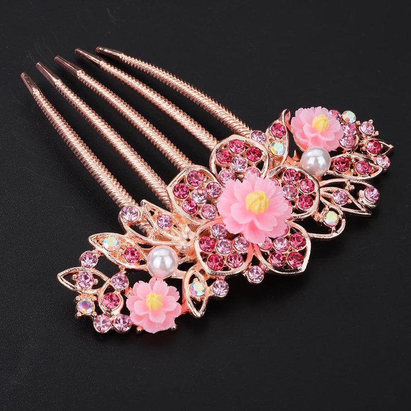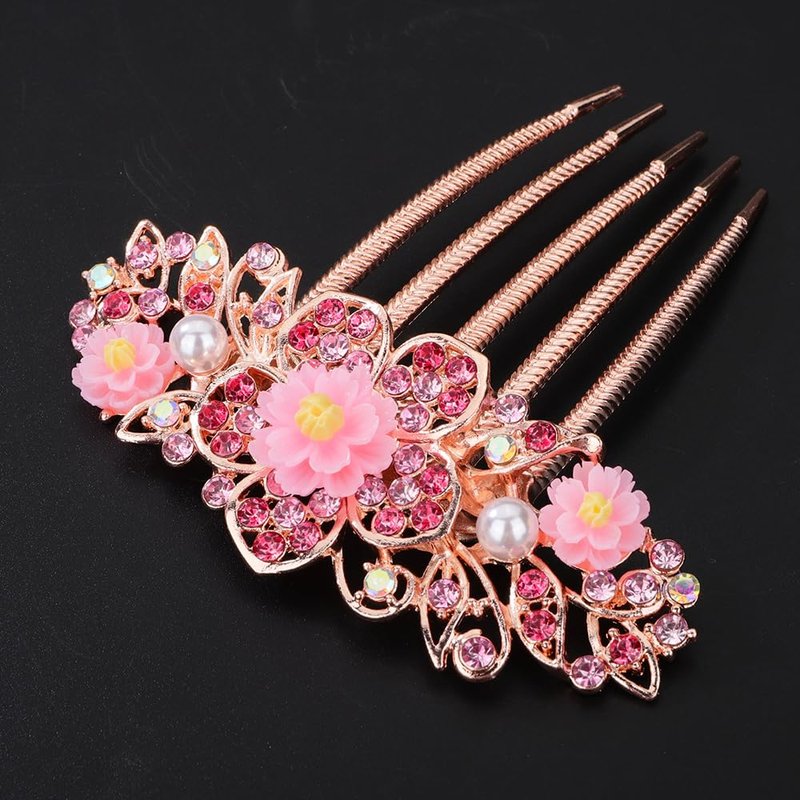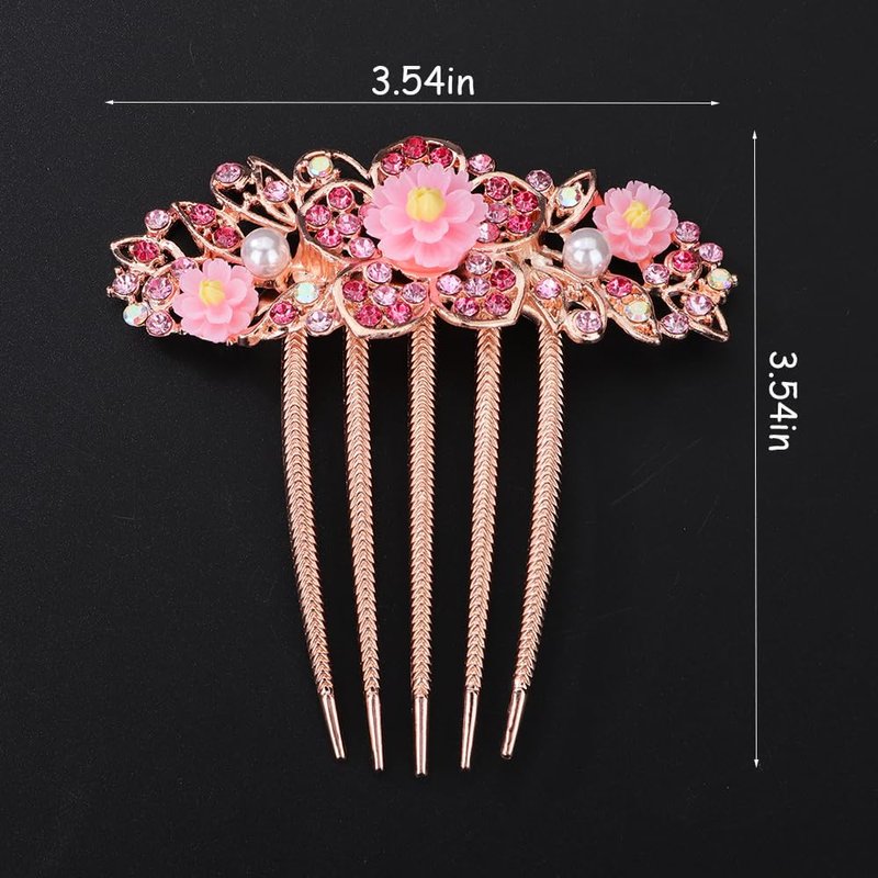 Chargances Bridal Flower Floral Hair Comb Wedding Pink Crystal Rhinestones Women Hair Side Comb Boho Pearl Hair Accessories Headpiece for Women and Girls (Pink)