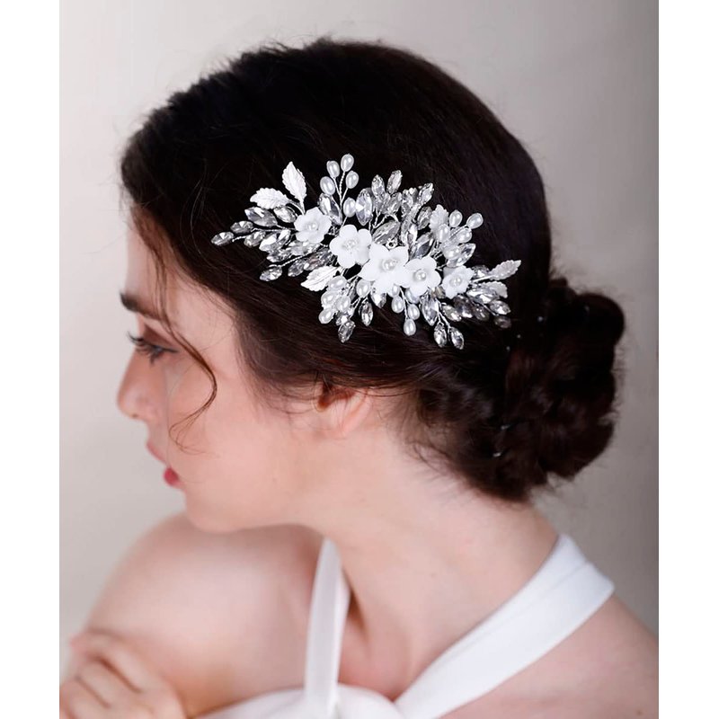 Chargances Bridal Flower Rhinestone Hair Comb Wedding Pearl Leaf Hair Side Comb Fashion Crystal Handmade Hair Accessories for Women and Girls (Rose Gold)