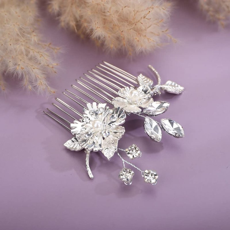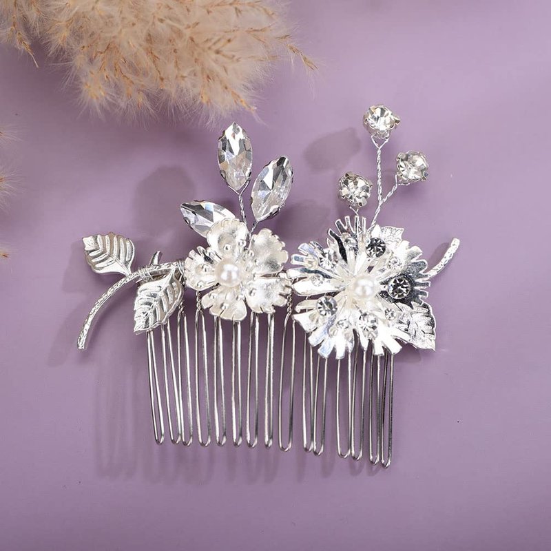 Chargances Silver Flower Crystal Hair Comb Wedding Leaf Pearl Hair Side Comb Fashion Rhinestone Handmade Headpiece Bridal Hair Accessories for Wedding Prom Flower Girl