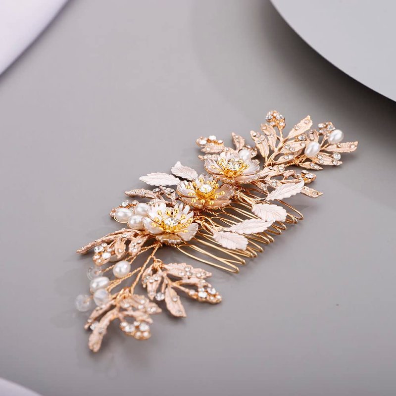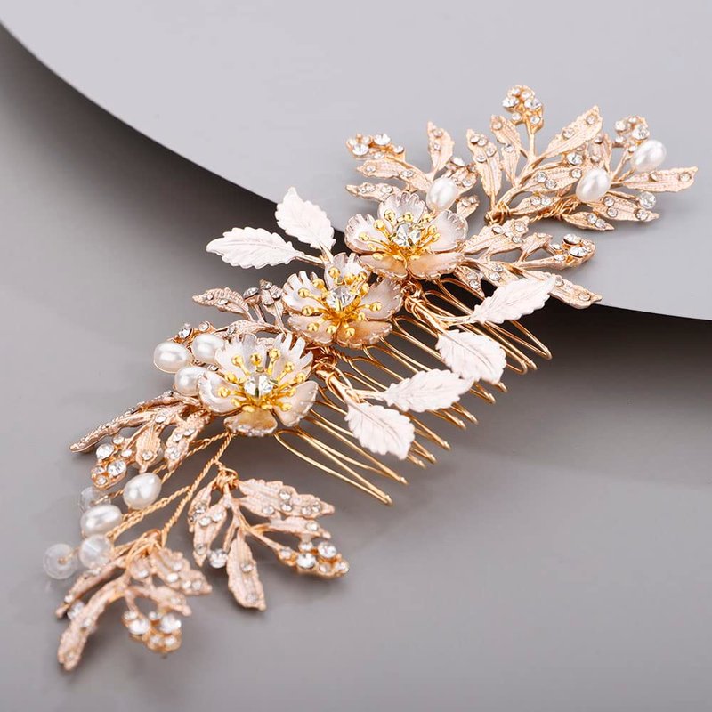 Chargances Wedding Flower Leaf Hair Comb Bridal Crystal Pearl Hair Side Comb Gold Rhinetone Handmade Headpiece Hair Accessories for Women and Girls (Gold)