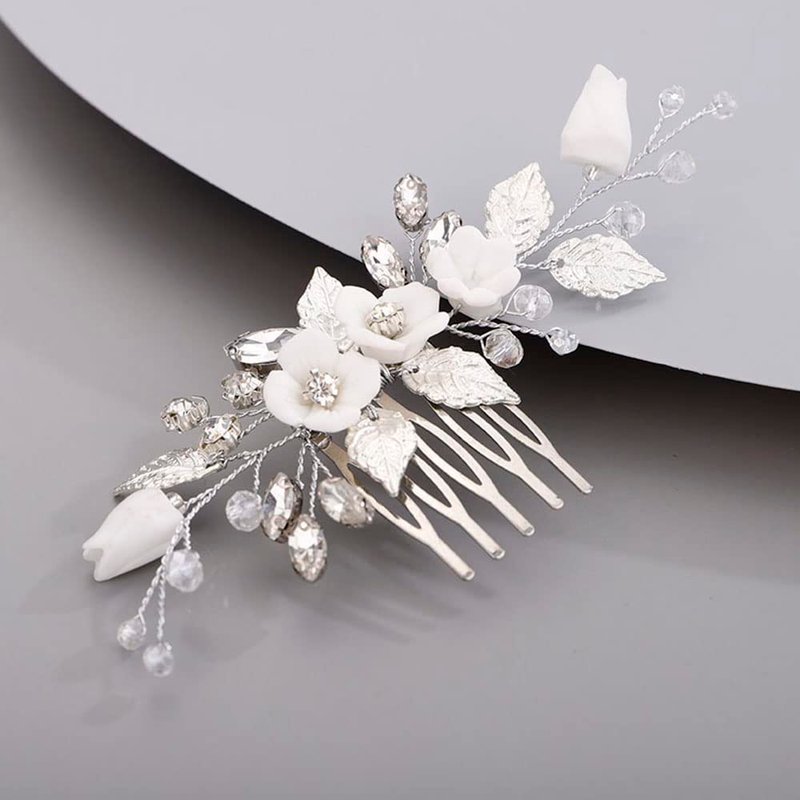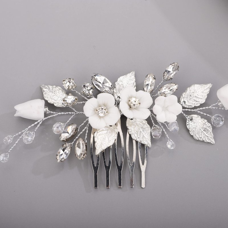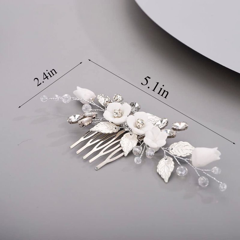 Chargances Wedding White Flower Rhinestone Hair Comb Bridal Silver Leaf Hair Side Comb Fashion Crystal Handmade Headpiece Hair Accessories for Women and Girls (Silver)