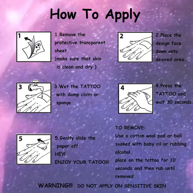 - ⚡Premium Quality,Waterproof and Sweat-resistant -- These unique tattoos typically last about 3-6 days.Can be removed with oil, makeup remover, or by scrubbing off. Safe to wear at the beach or in the shower or pool.