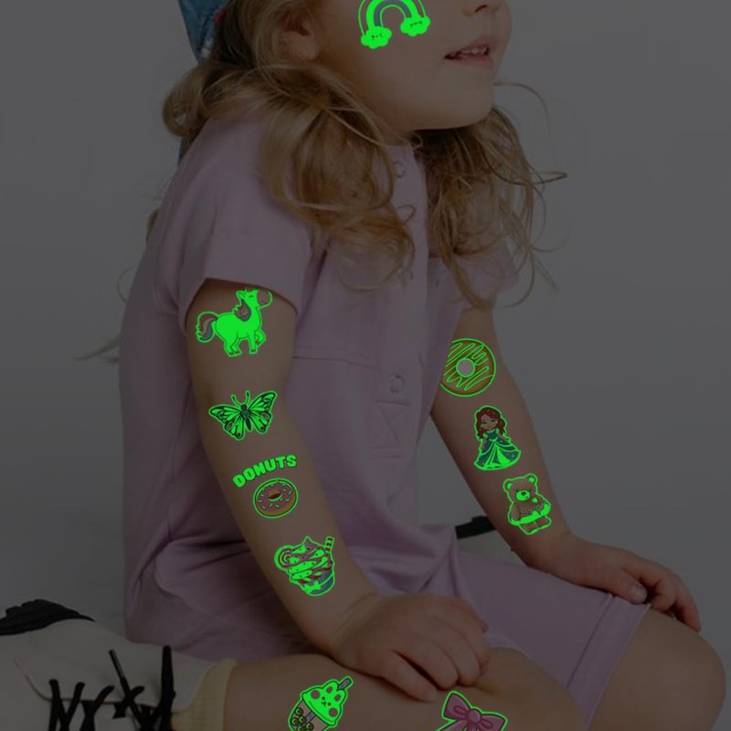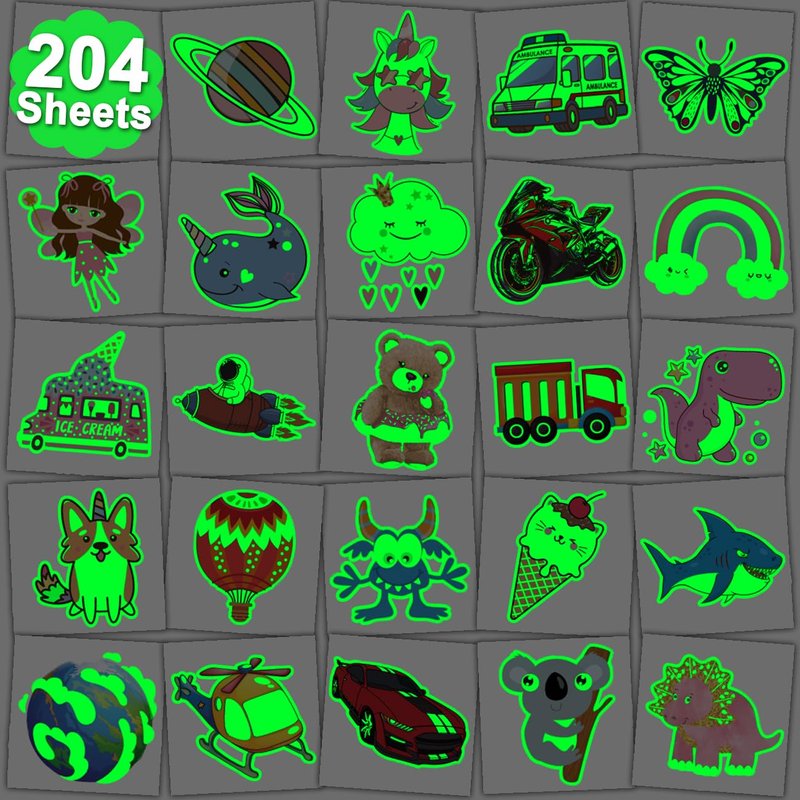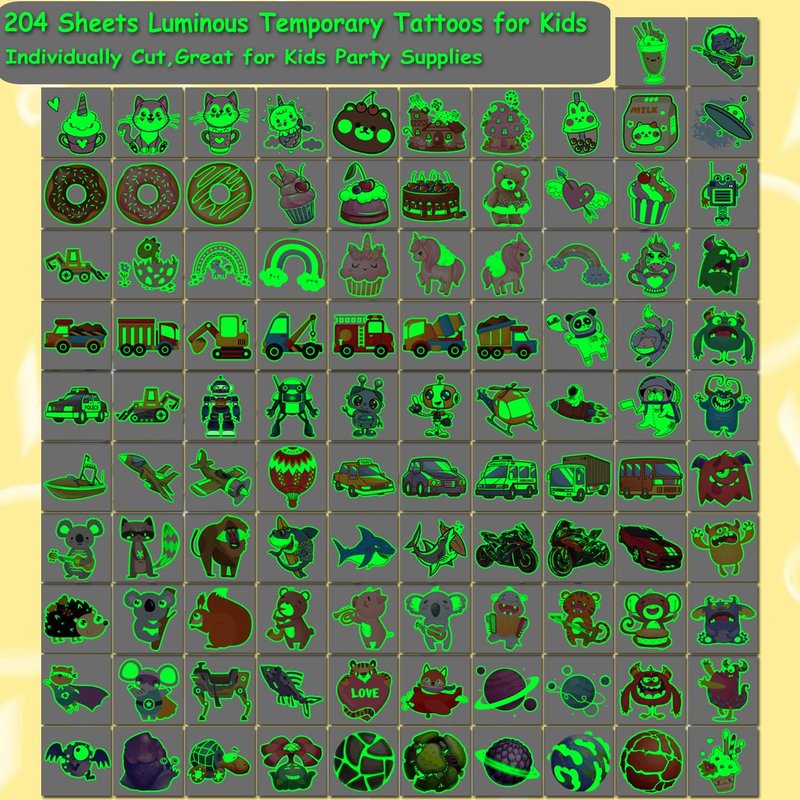 - ⚡Individually Wrapped Sheets No Need to Cut -- 204 PCS luminous tattoos individually wrapped to be easily included in a party gift bag. Easy to share,even if a lot of people's parties, you can have a different tattoo with others.These adorable tattoos will keep you and your little ones – and their friends – occupied for a while. Great for playdates, parties, or rainy days.