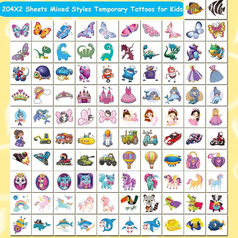 - ⚡Set includes 408 Mixed Kids Temporary Tattoos -- Super adorable and fun kids temporary tattoos. This tattoo sticker set contains many fun elements that kids will like (Butterfly,Princess,Mermaid,unicorn,Dessert,Dinosaur,Robot,Racing Car,Space,Shark,Monster,Fish,Animals..). Add an individual extra touch of fun to a children’s party or event with Charlent tattoos.
