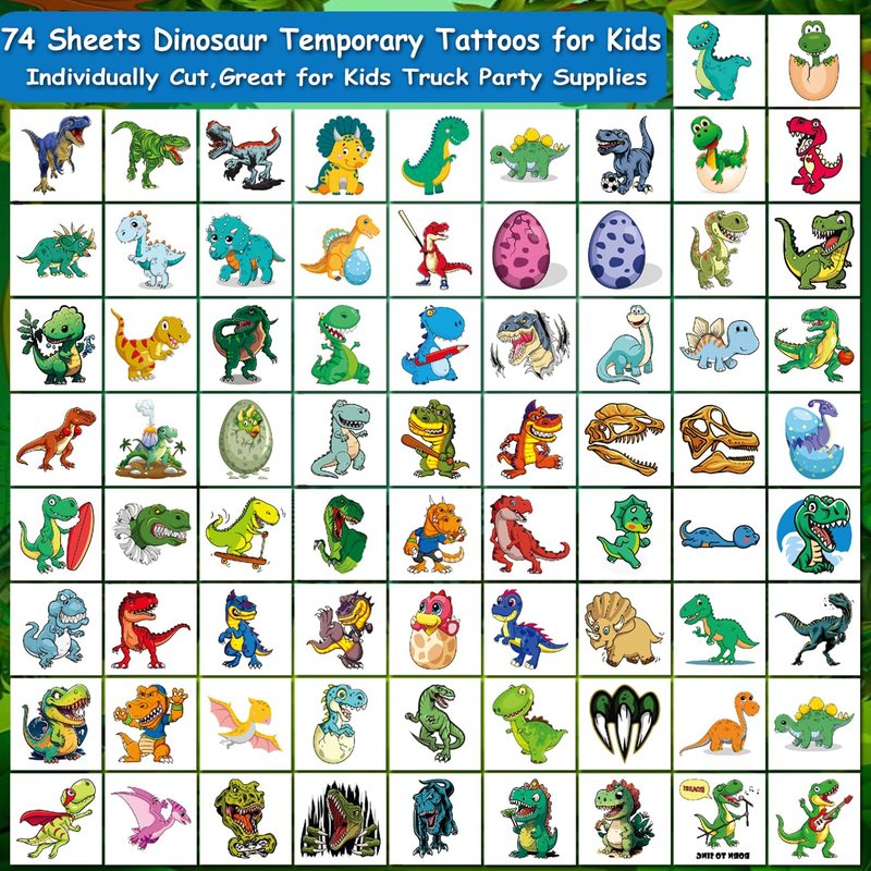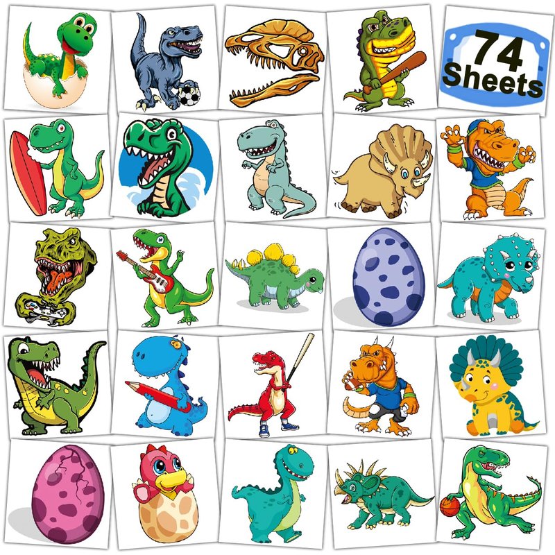Package contents: There are 74 sheets of dinosaur elements temporary tattoos