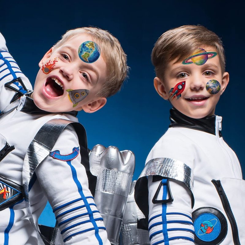 - ⚡Kids Space Party Tattoos -- Our Glitter tattoos are safe for your little ones,each tattoo is made of standard quantity material and green paper, which is safe and non-toxic. These are kids removable temporary tattoos! With these fake tattoos, your kids can deck themselves out with colourful designs that wash or peel off later. Have fun with our collection of removable, temorary tattoos for kids.