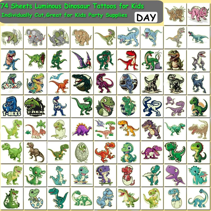 - ⚡Individually Wrapped Sheets No Need to Cut -- 74 PCS luminous dinosaur tattoos individually wrapped to be easily included in a party gift bag. Easy to share,even if a lot of people's parties, you can have a different tattoo with others.These adorable tattoos will keep you and your little ones – and their friends – occupied for a while. Great for playdates, parties, or rainy days.