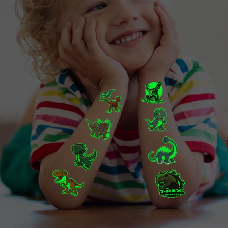 - ⚡Glow in The Dark Dinosaur Tattoos for All Occasions -- These awesome tattoos can be used in various occasions, such as kids birthday party supplies, party decorations, dinosaur party favors, party bags, DIY decorations, dinosaur luminous party supplies, pool and the beach or gift for kids and rewards. Kids temporary tattoos are the best party favors and goodie bags fillers ever for any kind of celebration!