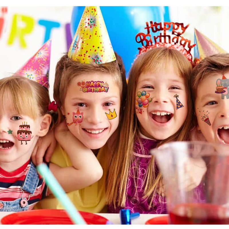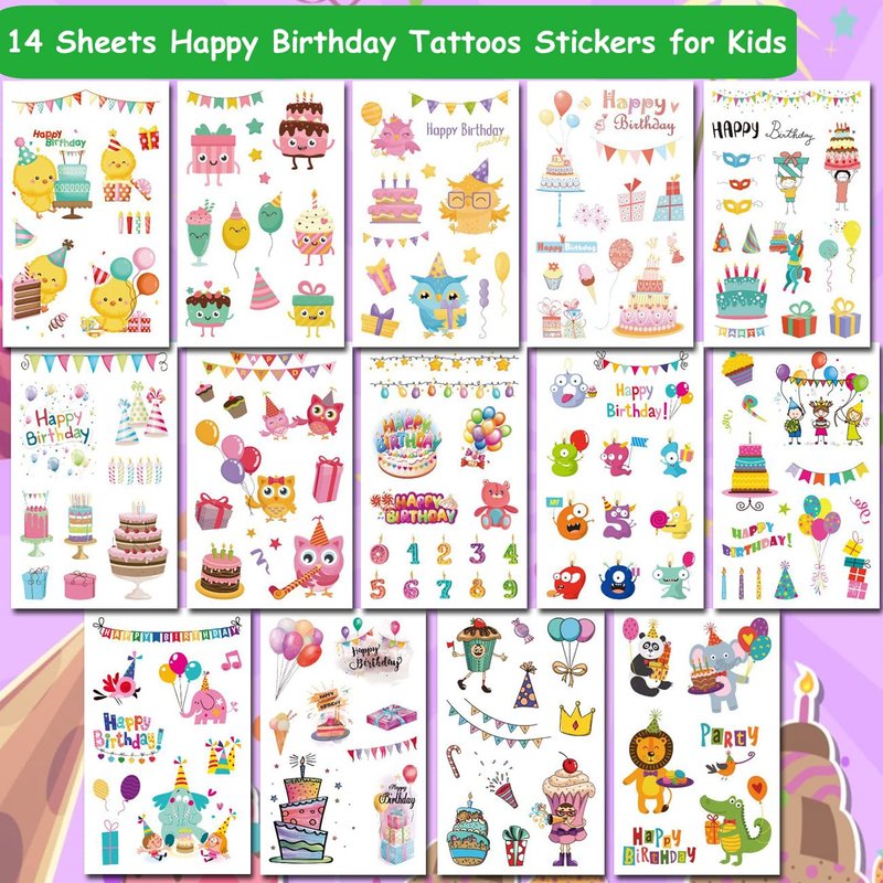 - ⚡14 Sheets Happy Birthday Temporary Tattoos for Girls Boys-- 120 PCS birthday tattoos total in 14 sheets to be easily included in a party gift bag. Easy to share,even if a lot of people's parties, you can have a different tattoo with others.These adorable tattoos will keep you and your little ones – and their friends – occupied for a while. Great for playdates, parties, or rainy days.