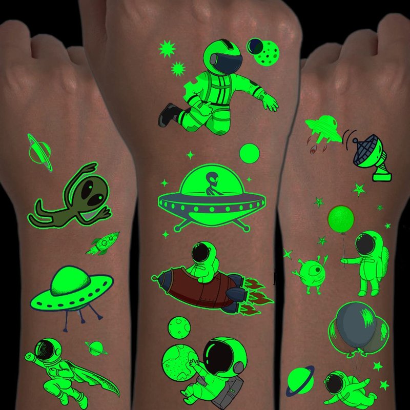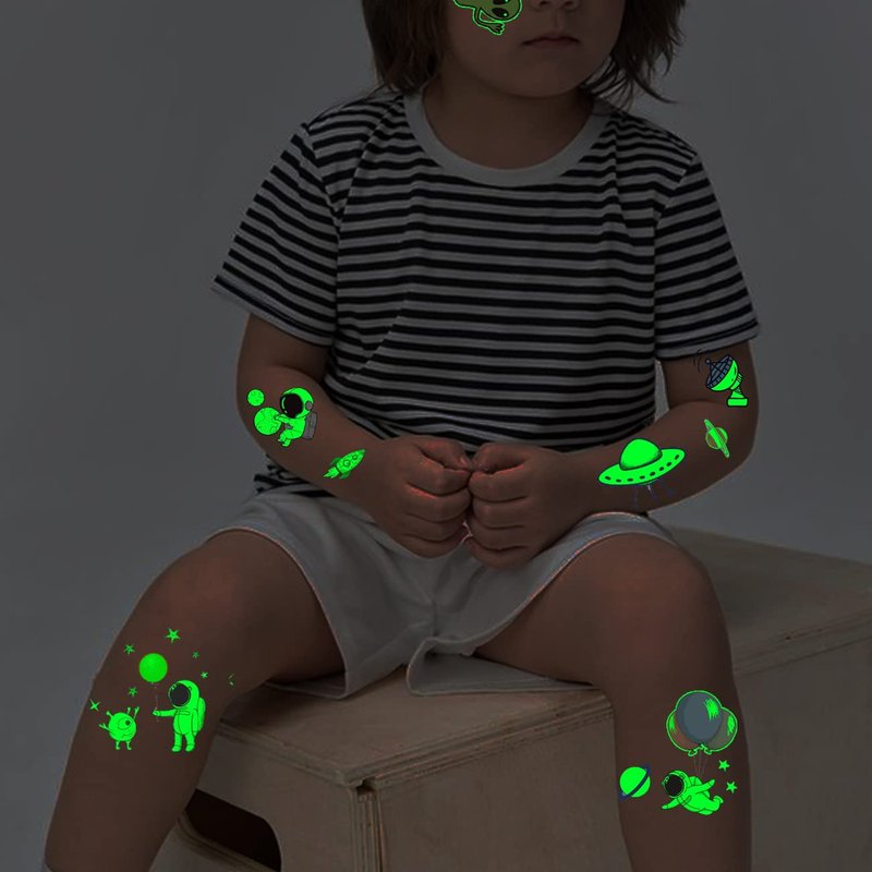 - ⚡14 Sheets Galaxy Tattoos for Boys Girls -- 100 PCS luminous tattoos total in 14 sheets to be easily included in a party gift bag. Easy to share,even if a lot of people's parties, you can have a different tattoo with others.These adorable tattoos will keep you and your little ones – and their friends – occupied for a while. Great for playdates, parties, or rainy days.