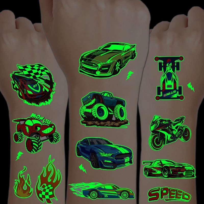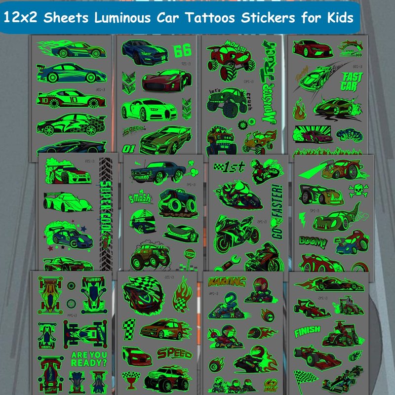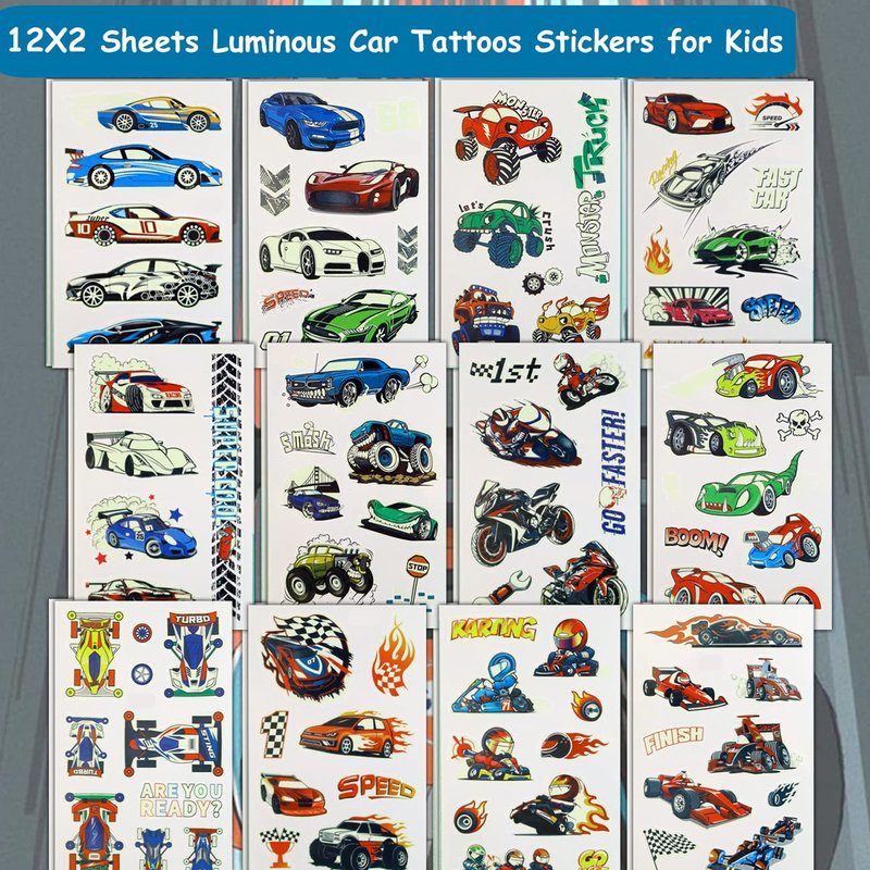 - ⚡24 Sheets Luminous Car Tattoos for Boys --180 PCS luminous tattoos total in 12 sheets to be easily included in a party gift bag. Easy to share,even if a lot of people's parties, you can have a different tattoo with others.These adorable tattoos will keep you and your little ones – and their friends – occupied for a while. Great for playdates, parties, or rainy days.