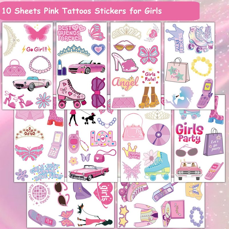 - ⚡10 Sheets PInk Party Accessories for Kids-- 80 PCS Cool tattoos total in 10 sheets to be easily included in a party gift bag. Easy to share,even if a lot of people's parties, you can have a different tattoo with others.These adorable tattoos will keep you and your little ones – and their friends – occupied for a while. Great for playdates, parties, or rainy days.